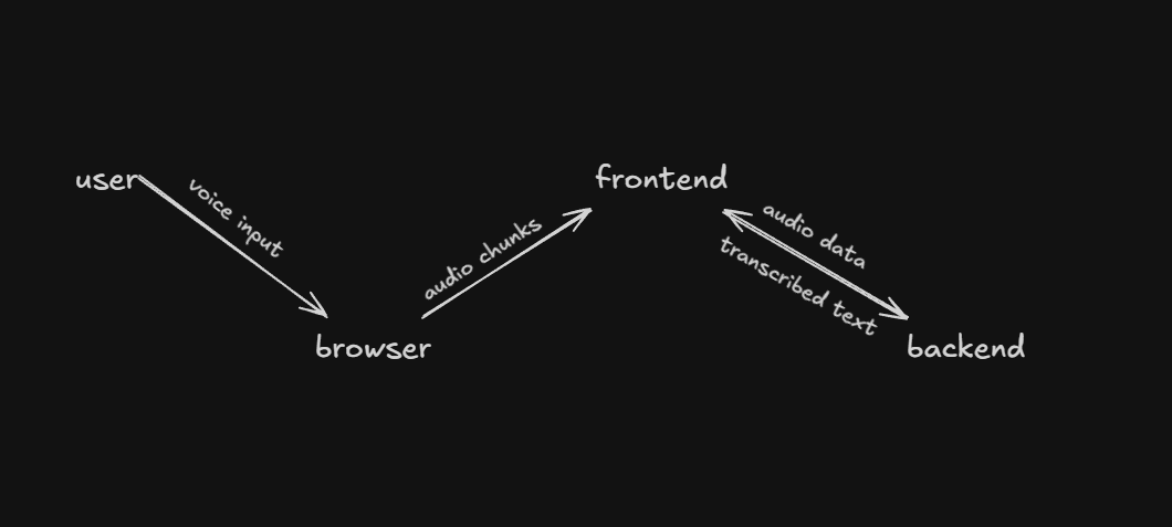 The implementation of STT was pretty straightforward. After some browsing, I decided to use the MediaRecorder Web API to record audio and store the audio chunks. Once the recording finishes, the chunks are sent to the backend, which returns the transcribed text that’s then shown to the user.